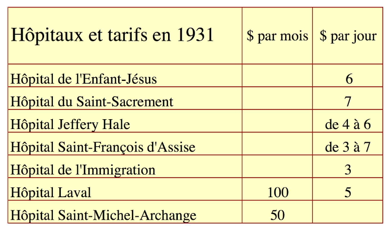 Coût de l'hospitalisation, chambre privéeLes prix des chambres privées variaient d'un hôpital à l'autre. Ils pouvaient aussi varier à l'intérieur d'un même établissement, suivant la chambre choisie. Des tarifs mensuels étaient offerts dans les hôpitaux où la plupart des patients étaient reçus pour de longues durées. C'était le cas des sanatoriums antituberculeux et des hôpitaux destinés aux troubles mentaux. Pour certains hôpitaux de Québec, tarifs demandés pour les chambres privées en 1931Source : Fifield, James Clark, éd., with the cooperation of the American Hospital Association, American and Canadian hospitals : a reference book giving historical, statistical and other information on the hospitals and allied institutions of the United States and possessions : and the Dominion of Canada, Minneapolis, Midwest Publishers Company, 1933, 1560 p. |