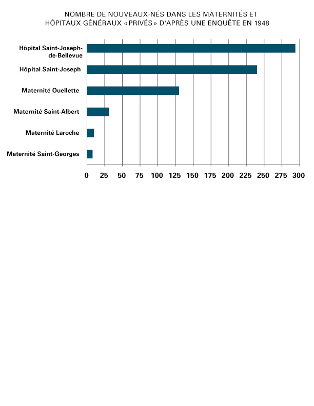 Hôpital Saint-Joseph-de-Bellevue ( 1944-05/01/1971 )Dans un premier temps, soit entre 1944 et 1949, l’hôpital Bellevue est un établissement de soins généraux à but lucratif. Les docteurs Antoine Couture, Norbert Bourgault et Fabien Gagnon en sont alors les propriétaires. L’institution, située sur le chemin Sainte-Foy, possède entre autres une salle de chirurgie et de rayons X en plus d’un service de consultation en oto-rhino-laryngologie. L’hôpital Bellevue compte alors un peu plus d’une trentaine de lits dont deux sont réservés aux enfants. Aussi, les dix moïses mis à la disposition des nouveaux-nés indiquent que l’établissement procède déjà à l’époque à un certain nombre d’accouchements. Hôpital Saint-Joseph-de-Bellevue, Chemin Sainte-Foy.Source : Centre d'archives de Québec, BAnQ / Fonds L'Action catholique. P428, 53, D13, Q7, P7. Sans date. Nouveaux-nés dans les maternités et hôpitaux généraux "privés" en 1948Source : Québec (Province), Commission d'enquête sur les services de santé, Enquête sur les services de santé 1948 |