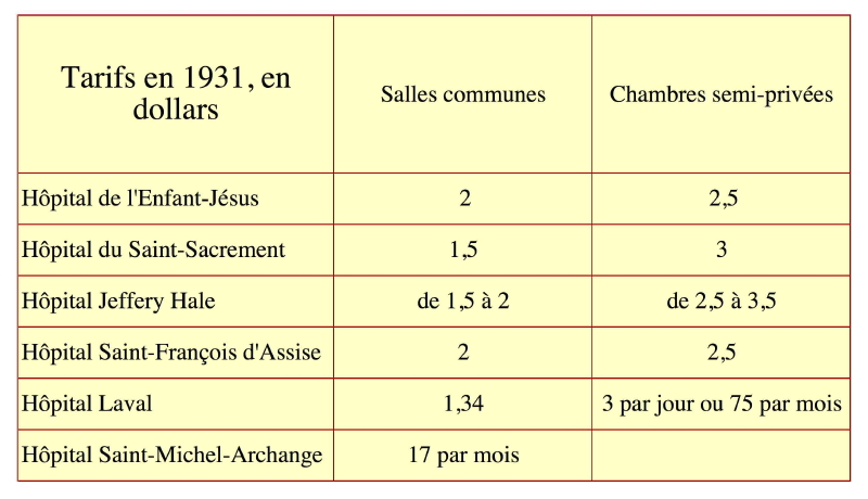 Tarifs pour une salle commune ou une chambre semi-privéePour ceux et celles qui ne pouvaient défrayer une hospitalisation dans une chambre privée, les coûts étaient plus bas dans les chambres semi-privées (de 2 à 4 lits), et encore plus bas pour un lit dans une salle commune. Ce tableau donne les tarifs quotidiens, ou mensuels dans certains cas, des lits de chambres semi-privées et des lits de salles communes dans certains hôpitaux de Québec, en 1931. Tarifs pour les salles communes et les chambres semi-privées, 1931Source : Fifield, James Clark, éd., with the cooperation of the American Hospital Association, American and Canadian hospitals : a reference book giving historical, statistical and other information on the hospitals and allied institutions of the United States and possessions : and the Dominion of Canada, Minneapolis, Midwest Publishers Company, 1933, 1560 p. |