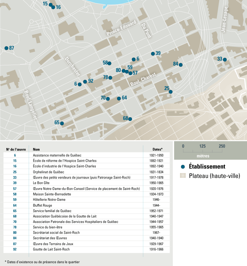 Service du bien-être ( 1955-vers 1968 )Le Service du bien-être vise l’administration générale et l’application de la Loi de l’Assistance publique et de celle des Écoles de protection de la jeunesse dans la ville. Il exerce une autorité sur les jeunes résidant à Québec depuis au moins 6 mois, une condition exigée pour le placement dans une école de protection de la jeunesse, et depuis un an, selon les règles du Service de l'assistance publique, pour le placement dans des institutions comme les orphelinats, par exemple. Les personnes qui ne rencontrent pas ces délais doivent d’abord s'adresser aux autorités municipales de la localité où elles résidaient auparavant, jugée responsable d’une partie du coût de leur placement en institution. Le Service du bien-être aurait, de plus, dans certains cas, défrayé les coûts de services dentaires pour des enfants de familles trop pauvres pour les assumer. Oeuvres et services du quartier Saint-RochSource : Production: La ville de Québec comme laboratoire sociohistorique. 1850-1950, CIEQ |
